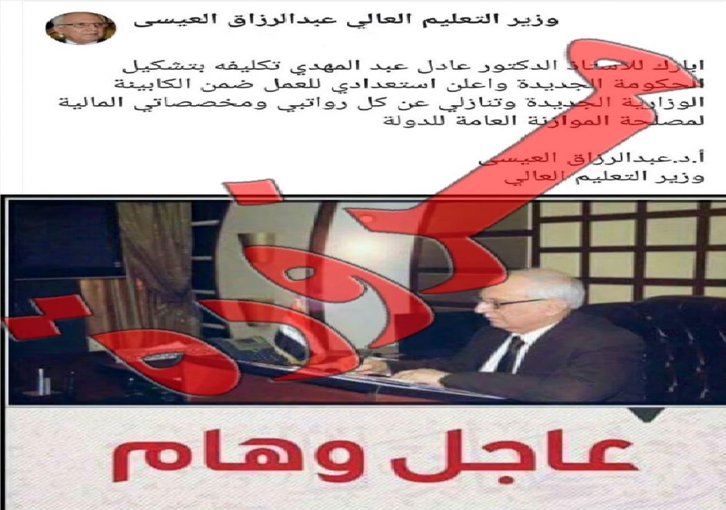 نهيب بمتابعي وزارة التعليم العالي والبحث العلمي وأخبارها وقراراتها بالحذر من صفحات مزورة تحمل اسم معالي وزير التعليم الدكتور عبد الرزاق العيسى وصفته ونجدد التنبيه بأن سيادته لا يملك حسابا في الفيس بوك وأن أي صفحة تحمل اسمه مزورة ولا نتحمل مسؤولية منشوراتها المزيفة والاشاعات التي تبثها.