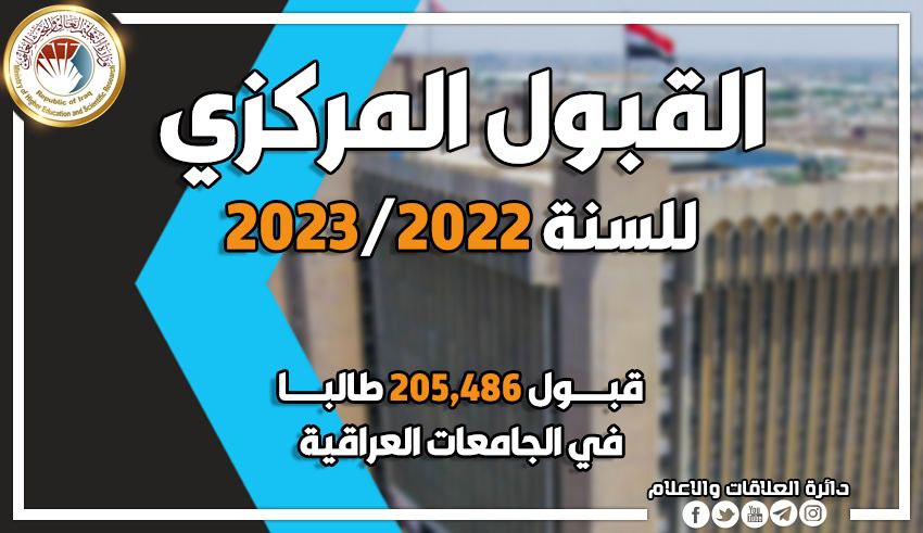تعلن وزارة التعليم العالي والبحث العلمي قبول مئتين وخمسة آلاف وأربعمئة وستة وثمانين طالبا وطالبة في الجامعات الحكومية العراقية ضمن قنوات القبول المركزي للسنة الدراسية 2023/2022.
