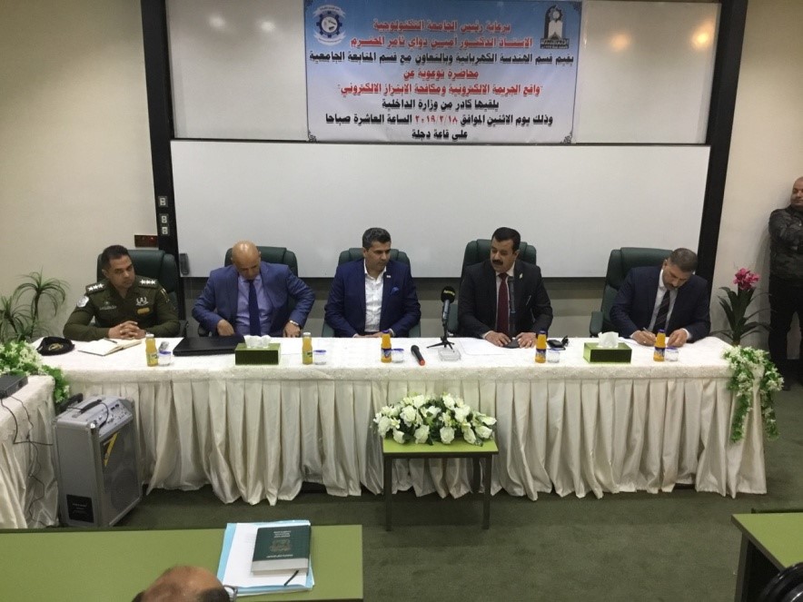 نظم قسم الهندسة الكهربائية في الجامعة التكنولوجية، محاضرة توعوية عن واقع الجريمة الالكترونية ومكافحة الابتزاز الالكتروني، بمشاركة طلبة وتدريسي الجامعة .