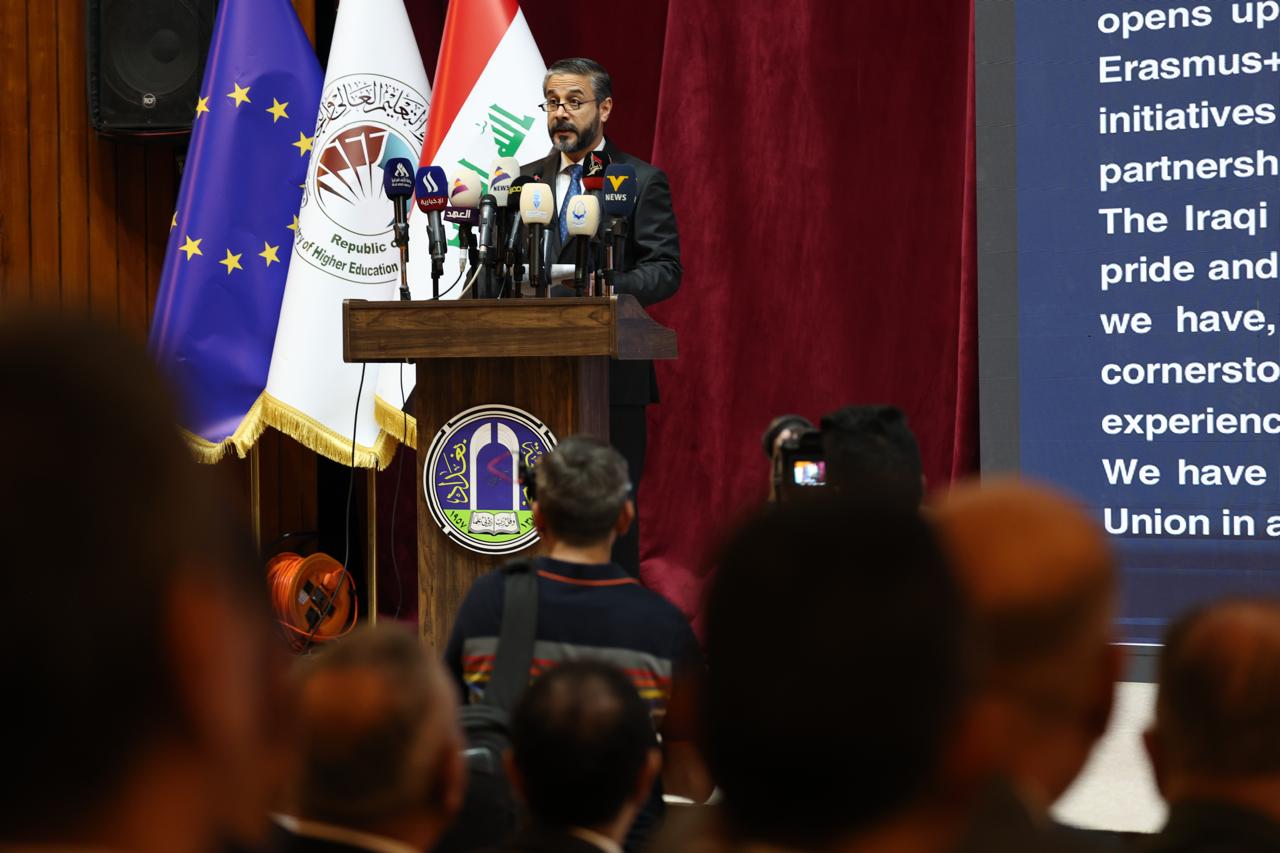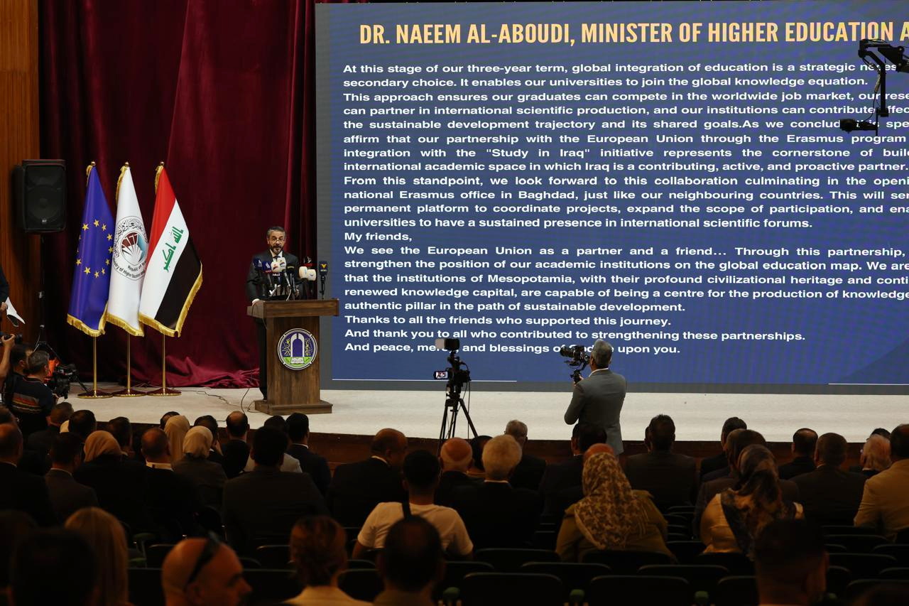 وفي كلمته خلال الفعالية أوضح وزير التعليم العالي والبحث العلمي الدكتور نعيم العبودي أن برامج التعاون مع الاتحاد الأوربي تمثل فضاءً حيويًا للارتقاء بالتعليم العالي والبحث العلمي مبينًا أن هذه البرامج تتيح للأساتذة فرصًا لتطوير خبراتهم وتوسيع حقولهم البحثية، وتمكّن الطلبة من خوض تجارب تعليمية متعددة الثقافات، وتفتح أمام الباحثين نوافذ معرفية واسعة، فضلا عن تمكين الملاكات الإدارية من اكتساب خبرات تنظيمية حديثة في إدارة التعليم الجامعي والحوكمة المؤسسية.