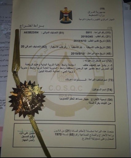 حصل التدريسي في كلية التربية البدنية وعلوم الرياضة في جامعة واسط الدكتور بشار عبد اللطيف هاتف , على براءة اختراع حول تصميم جهاز مساعد لتعلم مهارة التصويب من الثبات في كرة السلة.