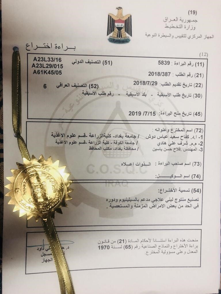 حصل فريق بحثي مشترك في جامعتي الكوفة وبغداد على براءة إختراع، لتمكنه من تصنيع منتوج لبني علاجي مدعم بالسيلينيوم ودوره في الحد من بعض الأمراض المزمنة والمستعصية.