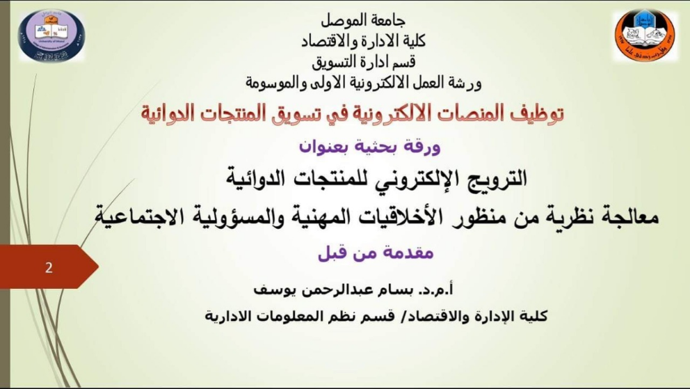 اقامت كلية الادارة والاقتصاد في جامعة الموصل ورشة علمية حول توظيف المنصات الإلكترونية في تسويق المنتجات الدوائية بمشاركة عدد من الاساتذة والباحثين في الجامعات العراقية والعربية.