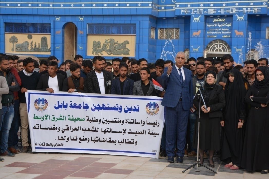 نظمت جامعة بابل وقفة احتجاجية، ضد الإساءات التي صدرت عن جريدة الشرق الأوسط ضد العراق ومقدساته.