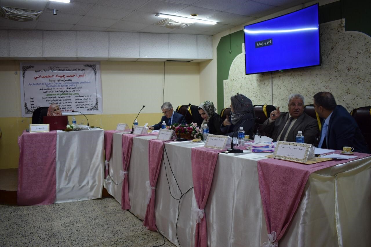 ناقشت رسالة ماجستير في كلية العلوم بجامعة الانبار، تطبيقات النظام النانوي للفضة والكربون وقشر الرمان في الخلايا الشمسي.