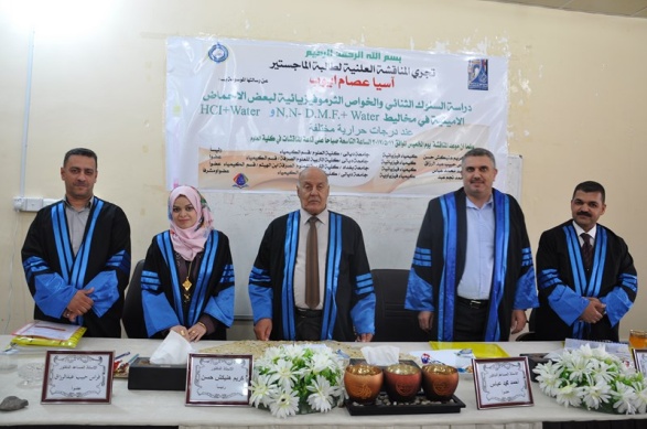 ناقشت رسالة ماجستير في كلية العلوم بجامعة ديالى, الخواص الثرموفيزيائية لبعض الأحماض الامينية عند درجات حرارة مختلفة, للطالبة آسيا عصام.