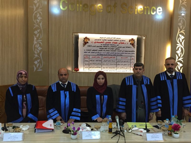 ناقشت رسالة ماجستير في كلية العلوم بجامعة القادسية العلاقة بين جيني المستقبل النووي و العامل الثاني المرتبط بعامل التنخر الورمي لمجاميع الدم وبعض المعايير الهرمونية و الكيمو حيوية في النساء المصابات بمتلازمة تكيس المبايض.