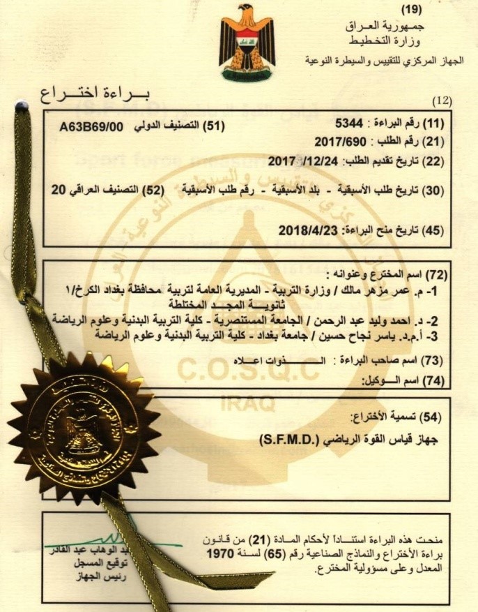 حصل فريق بحثي مشترك من جامعات المستنصرية وبغداد ووزارة التربية على براءة اختراع لتمكنهم من تصميم جهاز قياس القوة الرياضي (S.F.M.D).
