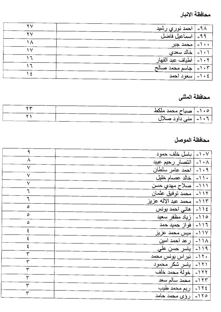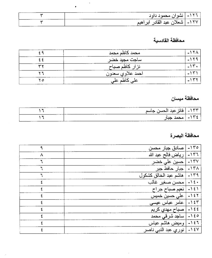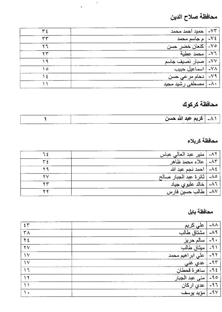 واضاف ان الانتخابات اسفرت ايضا عن اختيار 6 اعضاء لمحافظة كربلاء و5 اعضاء لمحافظة ذي قار و 5 اعضاء لمحافظة القادسية و 5 اعضاء لمحافظة ديالى و 4 اعضاء لمحافظة واسط و 3 اعضاء لمحافظة كركوك وعضوين اثنين لمحافظة ميسان ومثلهما لمحافظة المثنى.