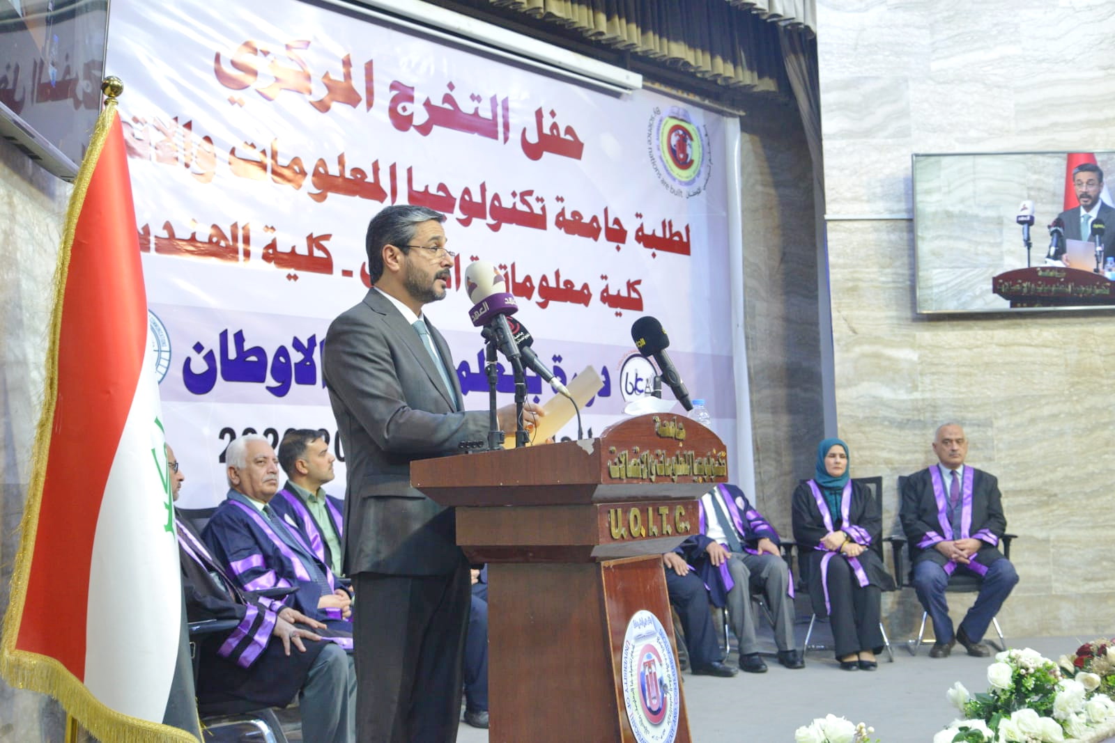 شارك وزير التعليم العالي والبحث العلمي الدكتور نعيم العبودي في الحفل المركزي لتخرج طلبة جامعة تكنولوجيا المعلومات والاتصالات للعام الدراسي 2022/2021.