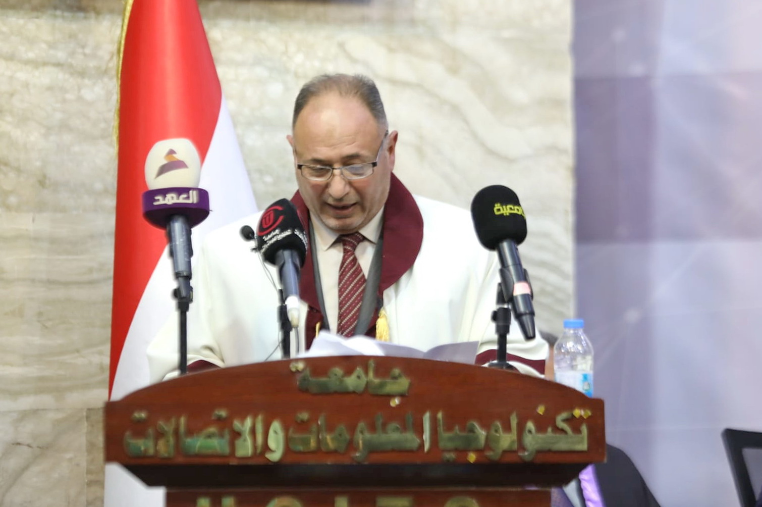 من جهته قال السيد رئيس جامعة تكنولوجيا المعلومات والاتصالات الدكتورعباس البكري في كلمته إن التحديات التي توجه الجامعات جعل منها بيئة للتكيف مع المتغيرات وتقديم الحلول العلمية والتقنية موضحا أن الجامعة فتحت نافذة مهمة على استحداث التخصصات المستقبلية التي سيحتاج اليها المجتمع.