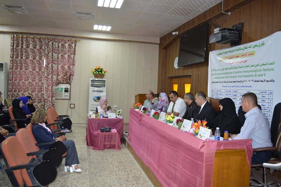 ناقشت أطروحة دكتوراه في كلية الطب بجامعة بابل، التعدد الشكلي الجيني لبعض الانترفيرونات المرتبطة بالتهاب الكبد الفيروسي المزمن للنوعين B و C.