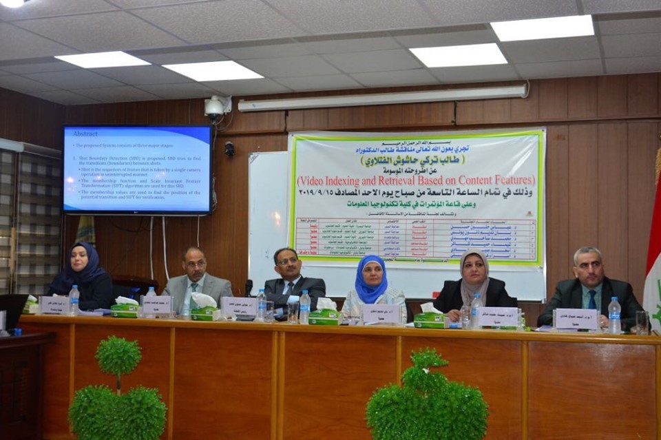 ناقشت أطروحة دكتوراه في جامعة بابل، فهرسة واسترجاع الفيديو بالاعتماد على خصائص المحتوى، للطالب طالب تركي حاشوش.