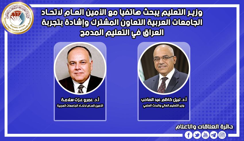 بحث وزير التعليم العالي والبحث العلمي الأستاذ الدكتور نبيل كاظم عبد الصاحب مع الأمين العام لاتحاد الجامعات العربية الأستاذ الدكتور عمرو عزت سلامة عبر مكالمة هاتفية سبل التعاون ونتائج التنسيق بين الجامعات العربية في ضوء المستجدات الاقتصادية والصحية التي يواجهها العالم.
