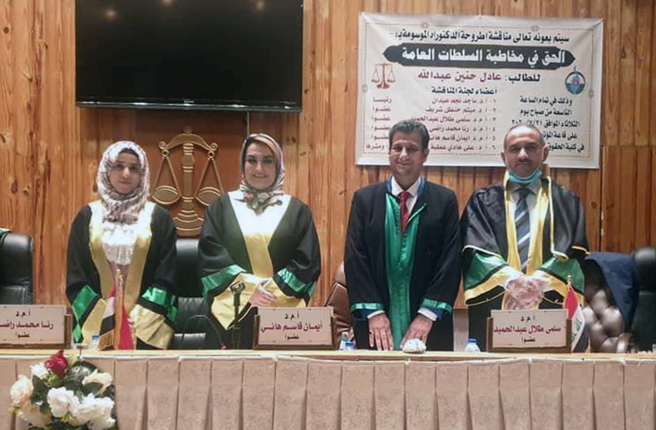 ناقشت اطروحة دكتوراه في كلية الحقوق بجامعة النهرين، الحق في مخاطبة السلطات العامة، للطالب عادل حنين عبد الله.