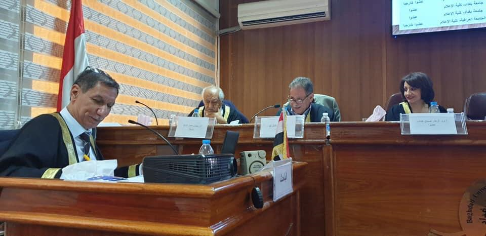 ناقشت أطروحة دكتوراه في كلية الإعلام بجامعة بغداد، السرد في الخطاب الإعلامي – دراسة تحليلية في المواد الإخبارية في موقعي مونيتور ونقاش.