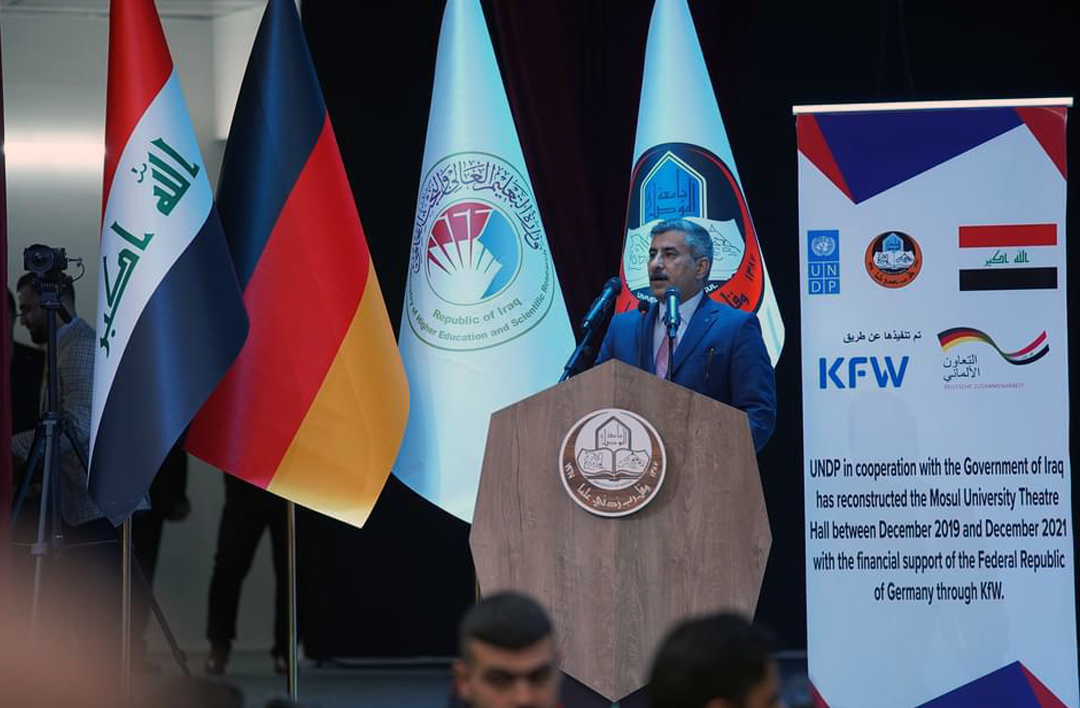 واستهلت الاحتفالية بكلمة للسيد وكيل وزارة التعليم العالي لشؤون البحث العلمي الدكتور ياسين العيثاوي أشاد فيها بجهود الجامعة وتعاون الداعمين الدوليين في الإسهام بإعادة الحياة الى الأبنية والمنشآت الجامعية في الموصل ومعالجة الأضرار التي خلفتها عصابات داعش الإرهابية فيما تلتها كلمات رئيس الجامعة وممثلي منظمة UNDP وبنك التنمية الألماني (KFW) الممول لمشروع إعادة تأهيل مسرح جامعة الموصل.
