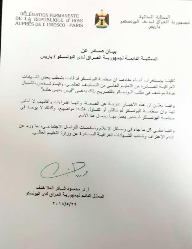 جددت وزارة التعليم العالي والبحث العلمي نفيها ما ورد في وسائل التواصل الاجتماعي بعدم الاعتراف وشطب الشهادات الصادرة عن الوزارة  من قبل منظمة اليونسكو. و اكدت الوزارة ضرورة تحري الدقة والموضوعية في نقل الاخبار وتناولها في وسائل الاعلام  ومواقع التواصل الاجتماعي.