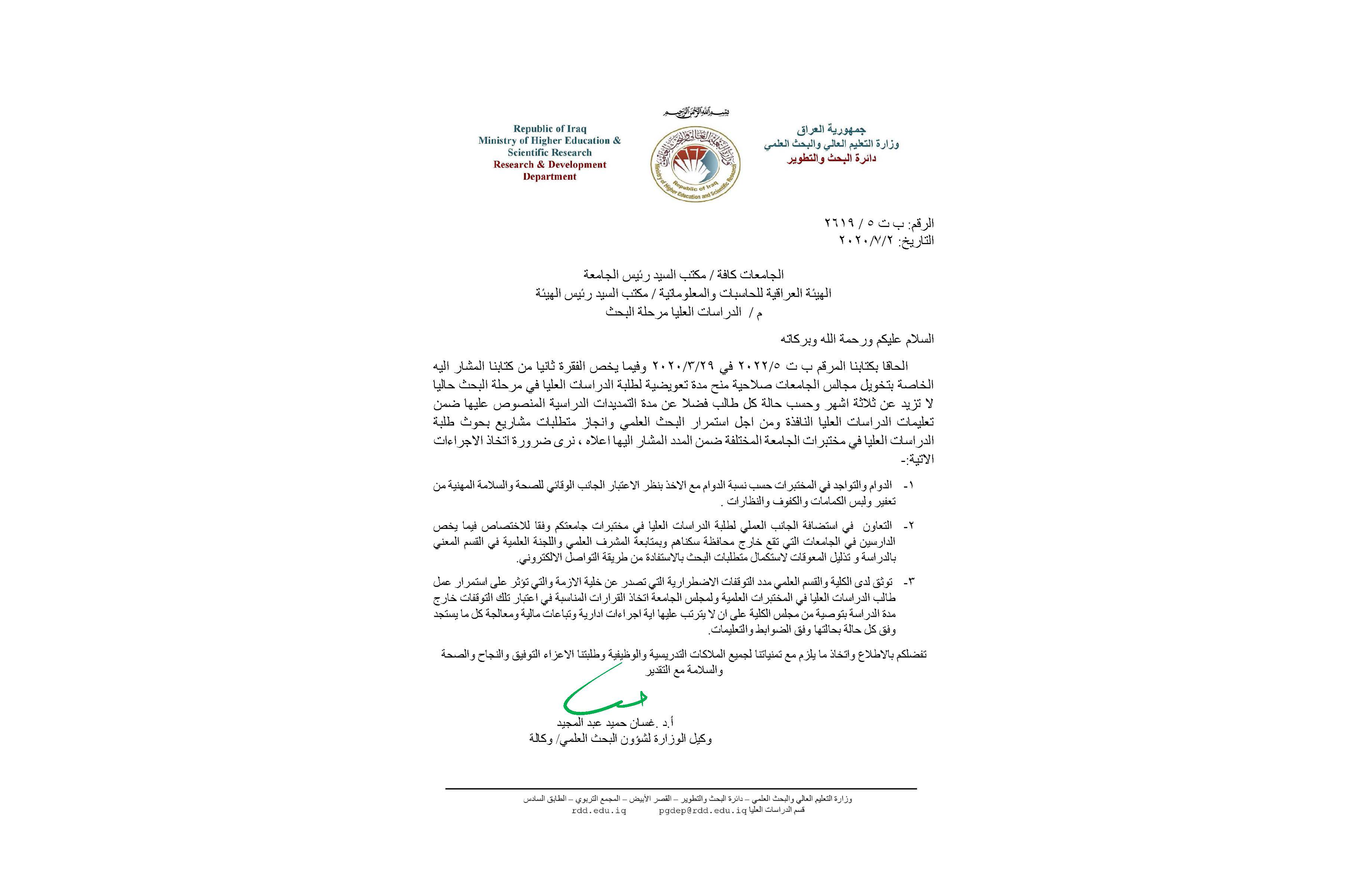 أصدرت وزارة التعليم العالي والبحث العلمي معالجات خولت بموجبها الجامعات اتخاذ الإجراءات اللازمة بشأن المتطلبات الخاصة بمشاريع بحوث طلبة الدراسات العليا.
