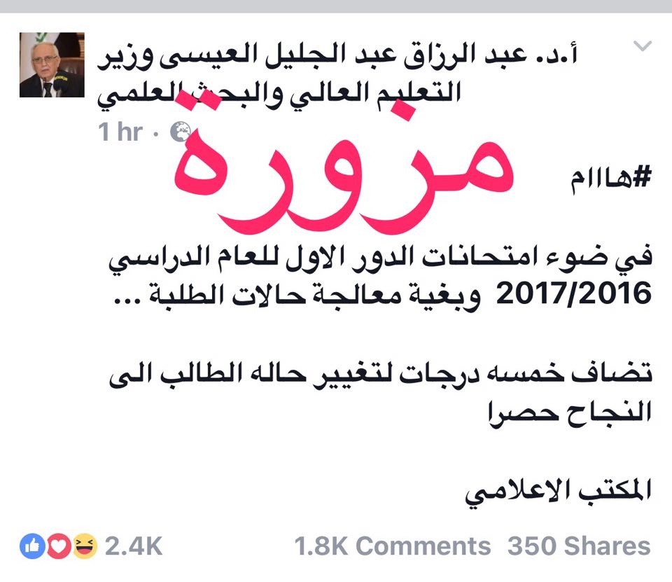 تجدد وزارة التعليم العالي والبحث العلمي تحذيرها من صفحات التواصل الاجتماعي التي تحاول العبث بالرأي العام . وتأكيدا لهذا السياق فان وزير التعليم العالي الدكتور عبد الرزاق العيسى لايمتلك اي صفحة في مواقع التواصل الاجتماعي وان كل صفحة تحمل اسمه مزورة ولا تتحمّل الوزارة مسؤولية المنشورات التي ترد في تلك الصفحات الوهمية .