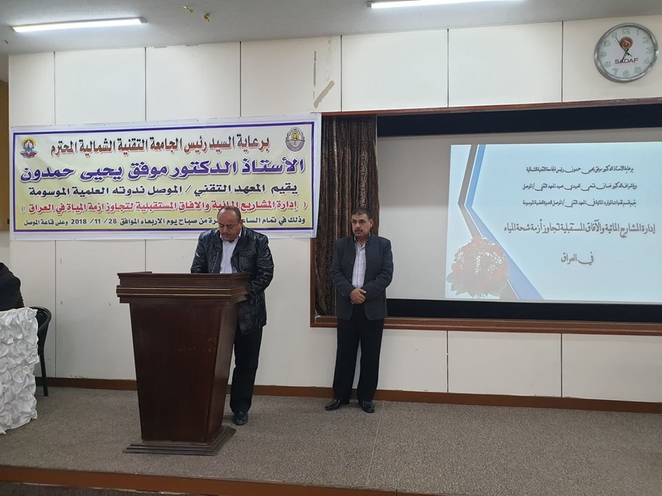 نظم المعهد التقني الموصل في الجامعة التقنية الشمالية, ندوة علمية عن الآفاق المستقبلية لتجاوز أزمة شح المياه في العراق، بمشاركة باحثين من مختلف الجامعات العراقية. وتضمنت الندوة مناقشة إدارة المشاريع المائية ومصطلح أزمة المياه ودور المشاريع المائية في تجاوز وأهمية سد الموصل واستعمال وسائل الري الحديثة والقوانين التي تضبط استهلاك المياه والاعتماد على المياه الجوفية في الشرب والاستعمالات اليومية والحد من تلوث المياه. ودعا الباحثون في الندوة إلى التخطيط لسياسة مائية مستقبلية في العراق، وأهمية ارتقاء الجامعة بنتاجاتها العلمية من اجل المساهمة في الحفاظ على مشاريع المياه لحل أزمات المياه في العراق.