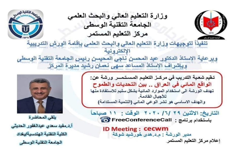 نظم مركز التعليم المستمر في الجامعة التقنية الوسطى ورشة علمية إلكترونية عن الواقع المائي في العراق التحديات والطموحات.