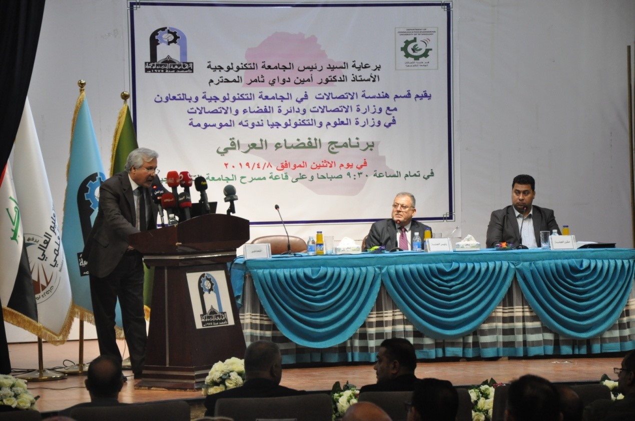 نظم قسم هندسة الاتصالات في الجامعة التكنولوجية ندوة علمية عن برنامج الفضاء العراقي بمشاركة خبراء وباحثين في وزارة الاتصالات ودائرة الفضاء والاتصالات في وزارة العلوم والتكنولوجيا.