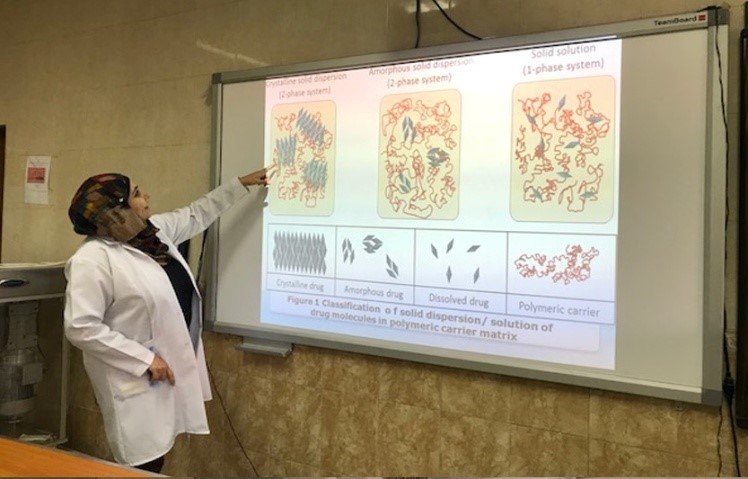 وتضمنت الورشة إلقاء عدد من المحاضرات عن التشتت الصلب، فضلا عن تطبيق تصنيع المتشتت الصلب لعقار الميلوكسيكام من خلال طرق مختلفة تشمل الانصهار وتبخر المذيب، واستعمال المايكرويف في الانصهار، وطرق الطحن.