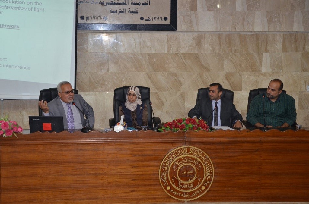 نظم قسم الفيزياء في كلية التربية بالجامعة المستنصرية، ندوة علمية عن متحسسات الألياف البصرية والبلورات الفوتونية، بحضور عدد من التدريسيين وطلبة الدراسات العليا. وتضمنت الندوة محاضرة علمية القاها مدير قسم الإتصالات بالليزر والألياف البصرية في وزارة العلوم والتكنولوجيا المدمجة الدكتور شهاب أحمد كاظم، بيّن فيها اهمية تقنية الألياف البصرية والبلورات الفوتونية وآلية توظيفها للعمل كمتحسسات كهرو بصرية في مختلف التطبيقات. وتناولت الندوة المفاهيم الأساسية التعريفية ومبادئ عمل متحسسات الألياف البصرية، وأنواعها المختلفة والتصاميم المتنوعة وبناء منظومات المتحسسات، فضلاً عن مناقشة مجموعة من البحوث العلمية المنجزة وقيد الإنجاز التي تتناول تطبيقات الألياف البصرية كمتحسسات. وتطرقت الندوة إلى عملية توظيف متحسسات الألياف البلورية الفوتونية PCE كخيار متقدم وبديل عن الألياف البصرية التي تعد من الأجيال الحديثة المتقدمة، والتعريف بالأجيال الحديثة والثقافات الجديدة المعتمدة عالمياً وكيفية مواكبة التطور العلمي في دول العالم بخصوص هذه التقنية الحيوية مع استعراض الأجيال الحديثة والمستقبلية منها Next generation ، فضلاً عن إجراء مقارنة مع واقع الحال في المؤسسات البحثية والأكاديمية العراقية في هذا الصدد.