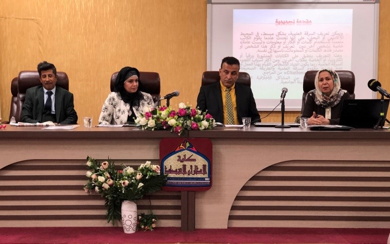 وتناولت الورشة الطرق الصحيحة للاستشهاد والاقتباس من المراجع، وكيفية التمييز بين المعلومات التي يمكن استعمالها من دون توثيق وبين المعلومات التي يجب ذكر مصادرها والإشارة إليها، وكيفية التقليل من نسب الاستلال في الجانب العملي، فضلاً عن إجراء تطبيق عن برنامج (Turnitin) العالمي الذي يستعمل لفحص نسب الإستلال الألكتروني في الرسائل والأطاريح الجامعية.