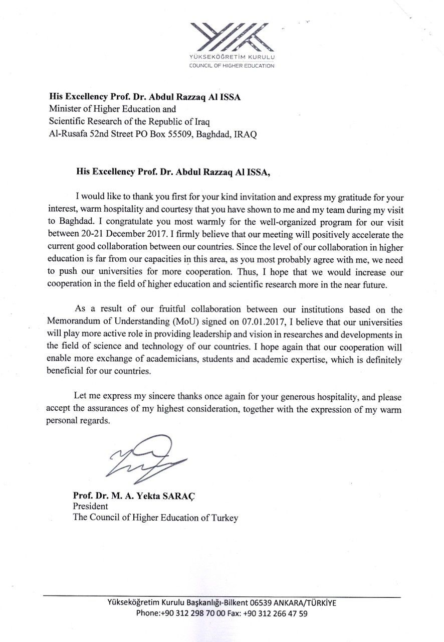 واعرب رئيس مجلس التعليم العالي التركي في رسالته عن جدية التعاون وفتح باب تبادل الأكاديميين والطلاب والخبرات التي ستكون ذات فائدة للبلدين مثمنا حرص ودعم وزير التعليم العالي الدكتور عبد الرزاق العيسى على تفعيل وانجاح مذكرة التفاهم بين بغداد وانقرة لتحقيق مستوى عال من التنسيق بين الجانبين.