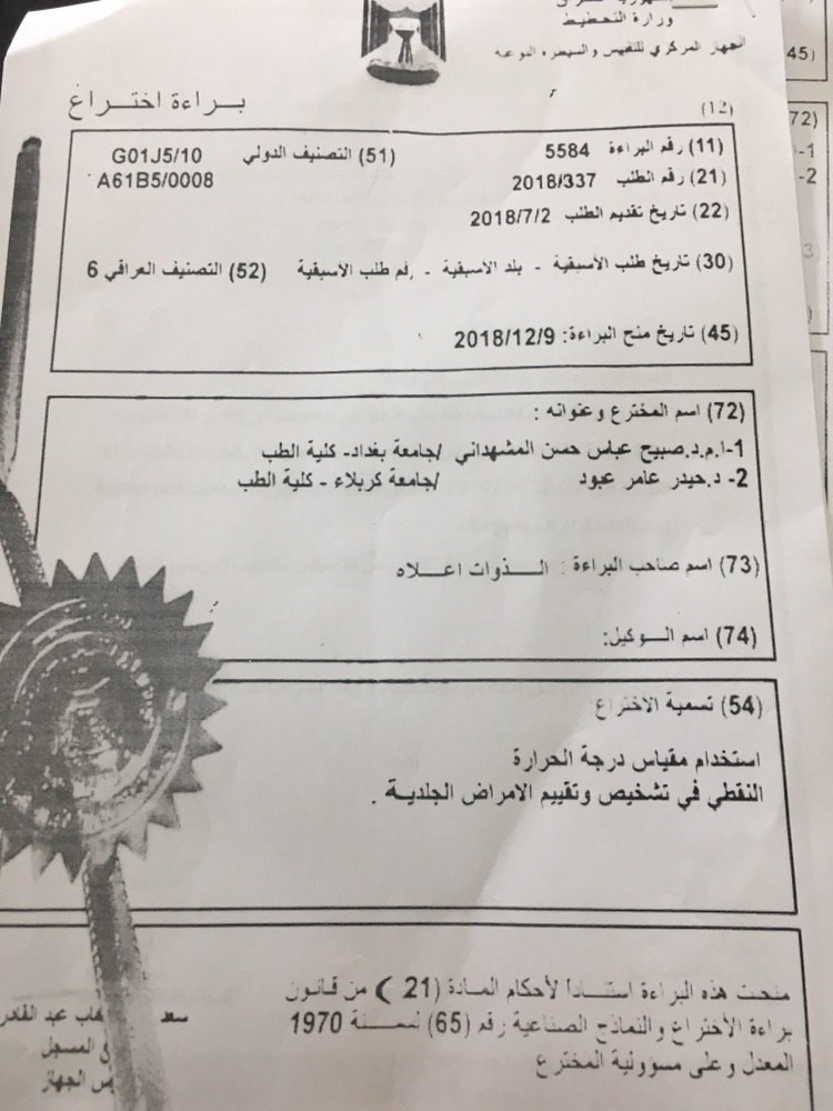تمكن باحثان من جامعتي كربلاء وبغداد من تسجيل براءة اختراع، عن اكتشاف طريقة جديدة لتقييم وتشخيص الأمراض الجلدية، باستعمال جهاز قياس درجة الحرارة النقطي بالأشعة تحت الحمراء.