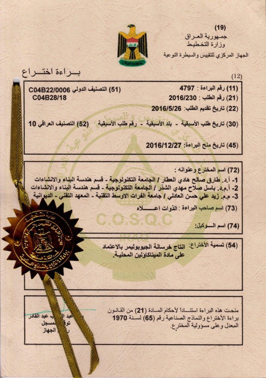 حصل تدريسيان في الجامعة التكنولوجية, على براءة اختراع ممنوحة من الجهاز المركزي للتقييس والسيطرة النوعية في وزارة التخطيط، عن انتاج خرسانة الجيوبوليمر.