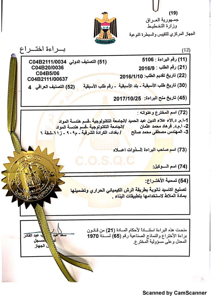 وتضمنت البراءة الممنوحة من جهاز التقييس والسيطرة النوعية في وزارة التخطيط, إنتاج مساحيق نانوية بواسطة تقنية الرش الكيميائي ومساحيق أكاسيد أحادية وثنائية المعدن وتضمينها بمادة الملاط لاستعمالها بتطبيقات البناء .