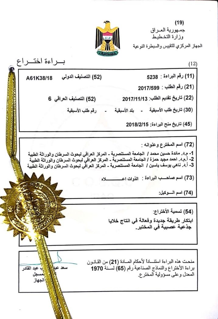 حصل فريق بحثي من المركز العراقي لبحوث السرطان والوراثة الطبية بالجامعة المستنصرية، على براءة اختراع لتمكنه من ابتكار طريقة جديدة وفعالة في إنتاج خلايا جذعية عصبية في المختبر.