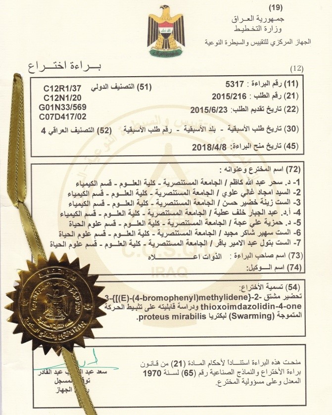 حصل فريق بحثي مشترك في كلية العلوم بالجامعة المستنصرية، على براءة إختراع لتمكنهم من تحضير مشتق 4-(3-بروموفنل مثليدين-2-ثايوإيميدازولين-4-اون) ودراسة قابلية تثبيط الحركة المتموجة لبكتريا proteus mirabilis.