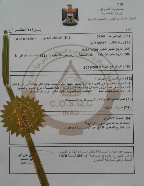 حصل فريق بحثي مشترك في كليتي الصيدلة والطب بالجامعة المستنصرية، على براءة إختراع لتمكنه من إستعمال مستخلص بذور الكرافيولا في علاج تقرح المعدة الناتج عن الأسبرين المحمض.
