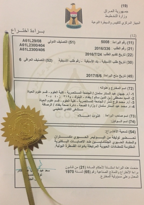 وتضمنت البراءة، التي منحها الجهاز المركزي للتقييس والسيطرة النوعية التابع لوزارة التخطيط، تحضير توليفة من الدكستران المنتج محلياً من بكتريا المعززات الحيوية مع مضاد الجنتامايسين لزيادة فعالية المضاد الحيوي تجاه البكتريا المرضية ذات المقاومة المتعددة للمضادات الحيوية لإيجاد الحلول المناسبة لمشكلة المقاومة للمضادات الحيوية والتي تعد إحدى المشاكل الصحية والإقتصادية على مستوى العالم.