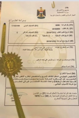حصل التدريسي في كلية الزراعة بجامعة الكوفة الدكتور فراس علي احمد الركابي على براءة اختراع في" التشخيص الجينومي المعلم المتخصص والسريع للكشف عن انواع الـPectobacteium باستخدام تقنية تضاعف الـ DNA المقترن مع الشريط الكاشف.
