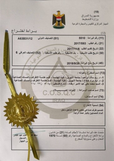 وتضمنت براءة الاختراع الممنوحة من الجهاز المركزي والتقييس والسيطرة النوعية التابع لوزارة التخطيط ، تصميم طرف صناعي مؤقت تأهيلي يساعد في التحسن التدريجي في الحالة البدنية والنفسية للمريض من ذوي الاحتياجات الخاصة للبتر الأحادي تحت الركبة.