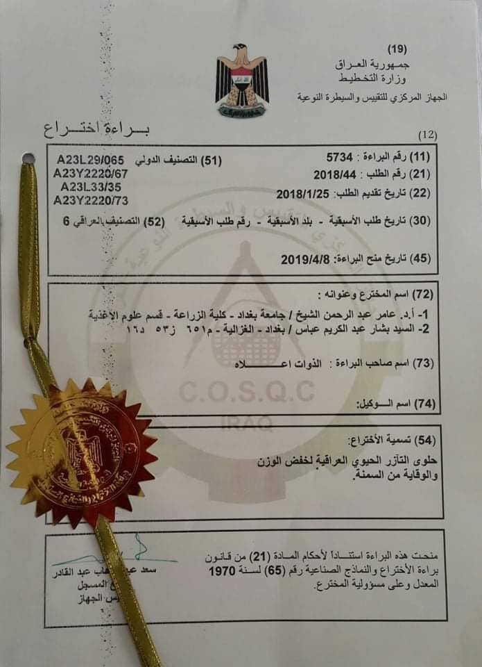 حصل التدريسي من قسم علوم الاغذية في كلية علوم الهندسة الزراعية بجامعة بغداد الدكتور عامر عبد الرحمن الشيخ ظاهر على براءة الاختراع عن حلوى التآزر الحيوي العراقية لخفض الوزن والوقاية من السمنة.