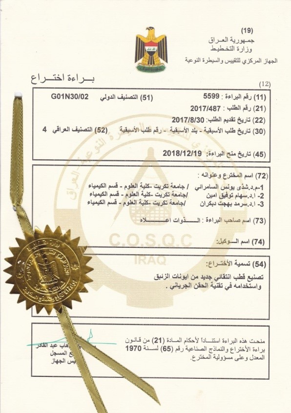 حصل فريق بحثي في جامعة تكريت، على براءة اختراع مشتركة عن تصنيع قطب إنتقائي جديد من أيونات الزئبق واستعماله في تقنية الحقن الجرياني.