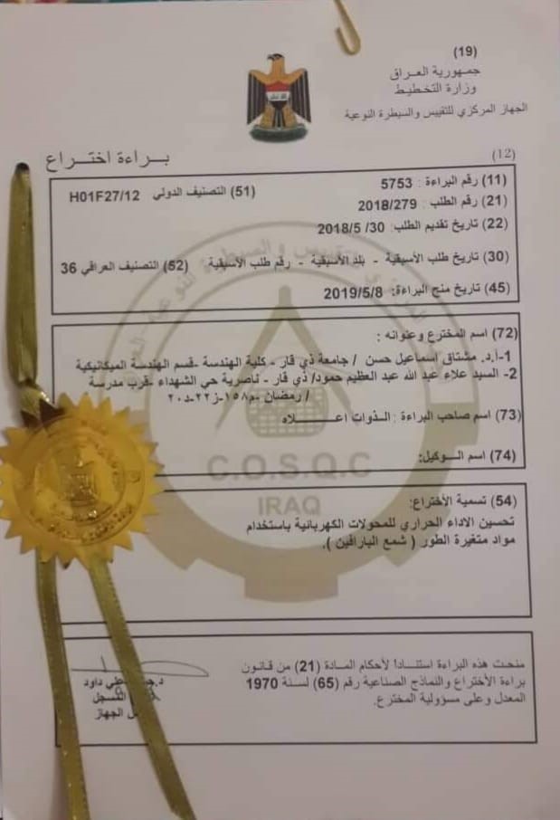 حصل التدريسي في كلية الهندسة بجامعة ذي قار الدكتور مشتاق إسماعيل حسن، على براءة اختراع عن تحسين الاداء الحراري للمحولات الكهربائية باستخدام مواد متغيرة الطور(شمع البافارين).