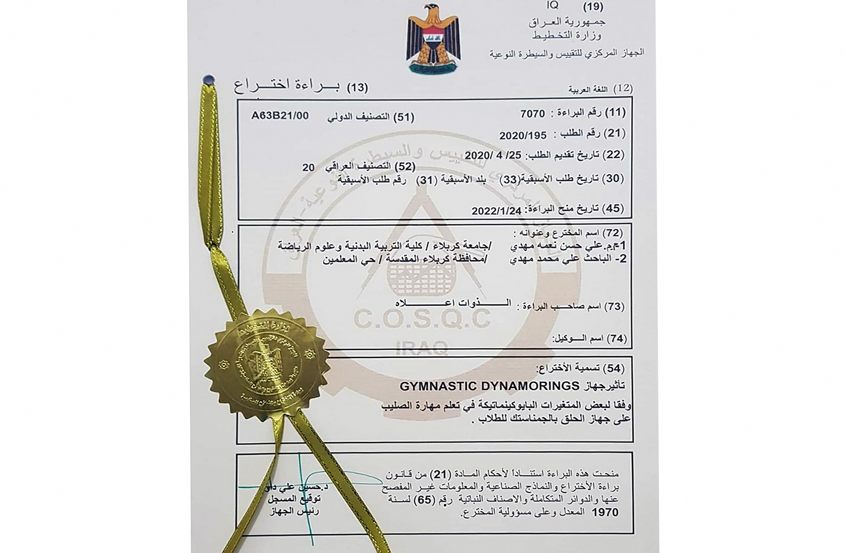 براءة اختراع في جامعة كربلاء عن تأثير جهاز (gymnastic dynamorings) وفقا لبعض المتغيرات البايوكيمنمياتيكة في تعلم مهارة الصليب على جهاز الحلق بالجمناستك