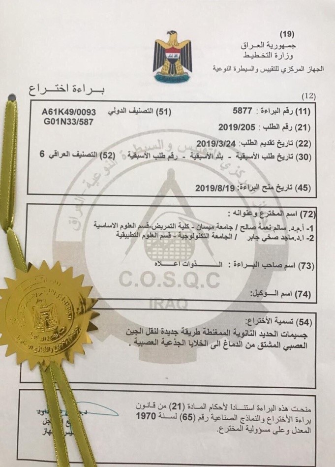 حصل التدريسي في كلية التمريض بجامعة ميسان الدكتور سالم نعمة صالح على براءة اختراع مشتركة عن جسيمات الحديد النانوية الممغنطة.