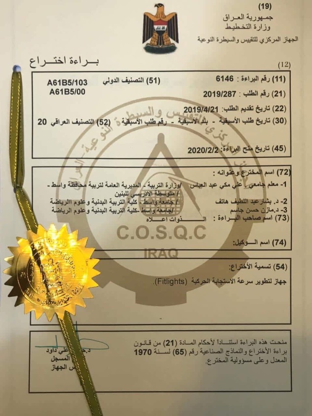 حصل الفريق البحثي في كلية التربية البدنية وعلوم الرياضة بجامعة واسط، المكون من الدكتور مازن حسن جاسم، والدكتور بشار عبد اللطيف هاتف بالاشتراك مع المعلم الجامعي علي مكي عبد العباس على براءة اختراع لتمكنهم من تصنيع جهاز تطوير سرعة الاستجابة الحركية (fitlights ) .