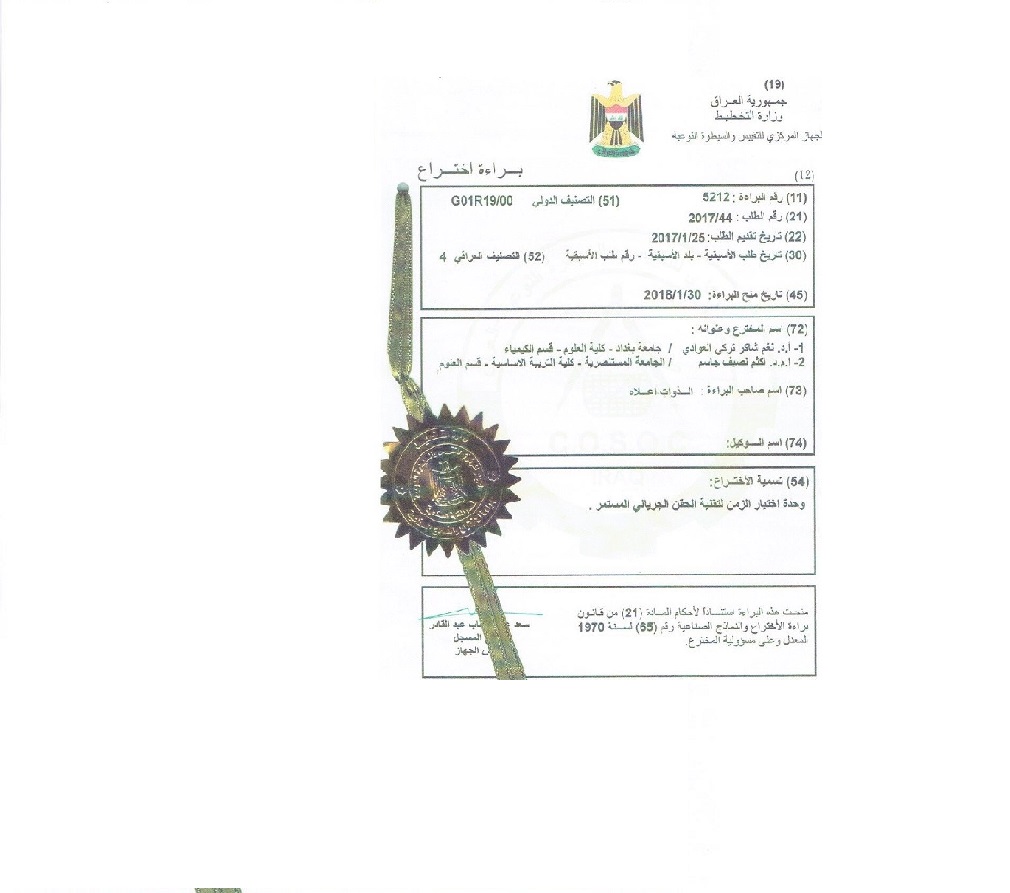 حصل فريق بحثي مشترك في جامعتي المستنصرية وبغداد على براءة اختراع، لتمكنهم من تصنيع وحدة اختيار الزمن لتقنية الحقن الجرياني المستمر. وتضمنت البراءة التي ضم فريقها البحثي كل من التدريسية في جامعة بغداد الدكتورة نغم شاكر ، والتدريسي في الجامعة المستنصرية الدكتور أكثم نصيف ، تصنيع جهاز جديد يعمل على إيقاف وإستمرار العمل بمنظومة تقنية الحقن الجرياني المستمر لمنظومات التفاعل الكيميائي، اذ تعد هذه التقنية من الطرائق الآلية ذات الكفاءة العالية والسرعة المتميزة والإستعادية الكبيرة والحساسية في التحاليل الكيميائية شبه الذاتية للمحاليل. وبينت البراءة التي منحها الجهاز المركزي للتقييس والسيطرة النوعية، ان الجهاز الجديد يوفر إمكانية إتمام عملية التفاعل لاسيما لتلك التفاعلات التي تحتاج إلى وقت كبير وبتطابقية عالية، والتقليل من صرف المواد الكيميائية ما يجعلها تقنية صديقة للبيئة.