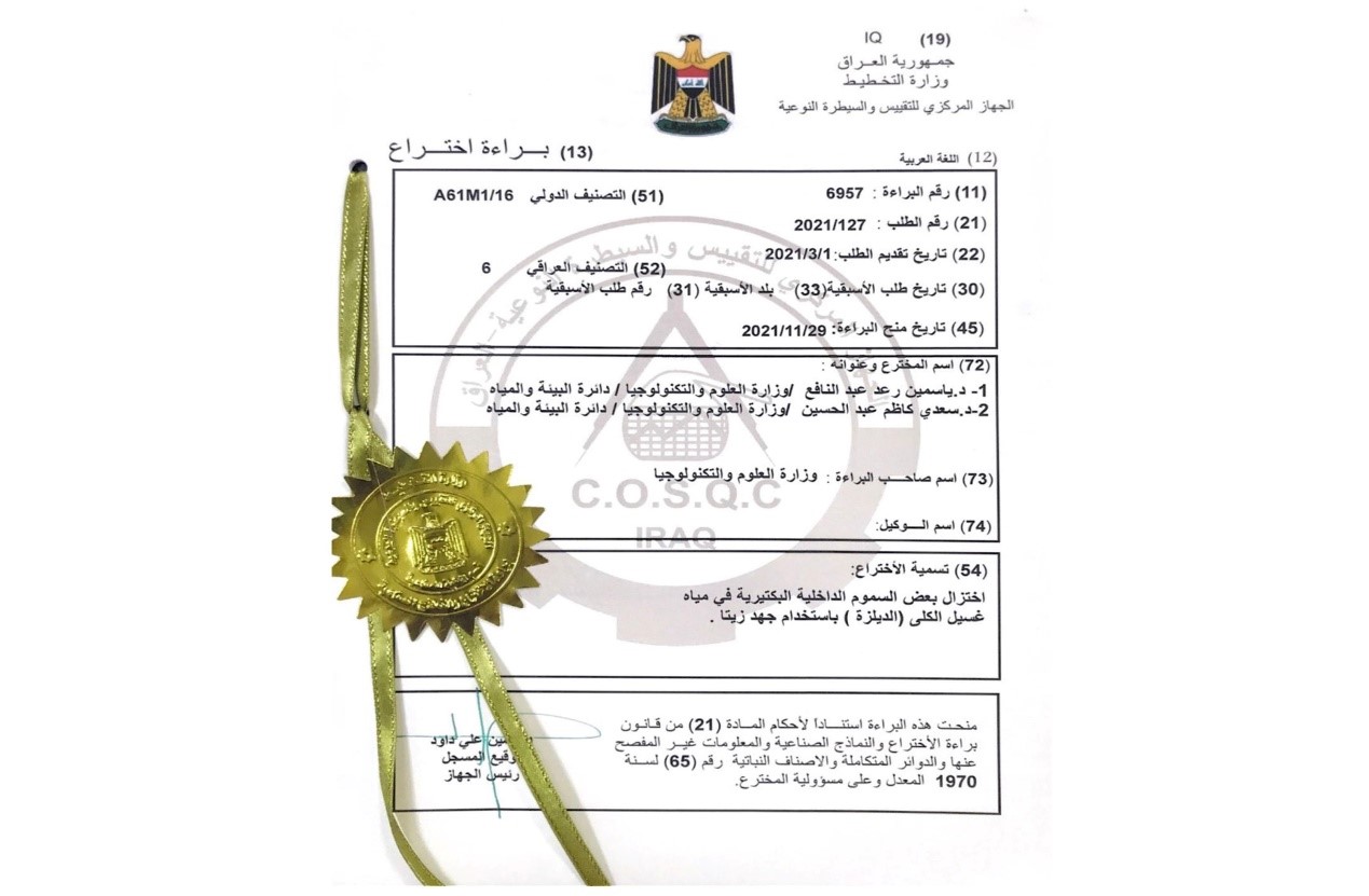 براءة اختراع في وزارة العلوم والتكنولوجيا المدمجة حول اختزال بعض السموم الداخلية البكتيرية في مياه غسيل الكلى (الديلزة) باستخدام جهد زيتا