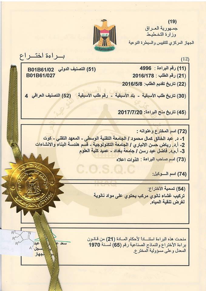 وتضمنت البراءة المشتركة للدكتور عبد الخالق كمال في الجامعة التقنية الوسطى, والدكتور رياض حسن من الجامعة التكنولوجية, والدكتور فاضل عبد رسن من جامعة بغداد, تطوير وتصنيع نوع جديد من الأغشية النانوية من خلال توظيف الأنابيب الكربونية النانوية المتعددة الجدران ( F-MWCNTS) في طبقة الدعم ومادة ( MCM-41 ) النانوية لغرض تنقية المياه.