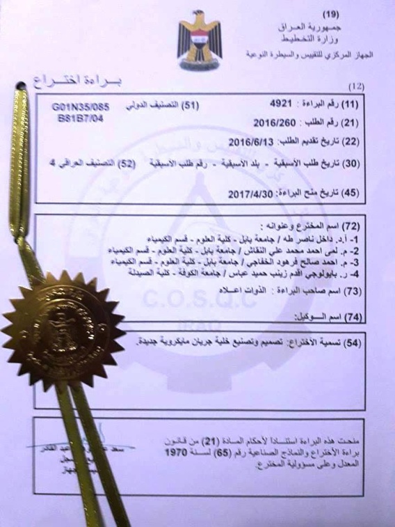 حصل فريق بحثي في كلية العلوم بجامعة بابل على براءة اختراع لتصنيعه خلية جريان مايكروية جديدة تستعمل في منظومات التحليل بالحقن الجرياني.